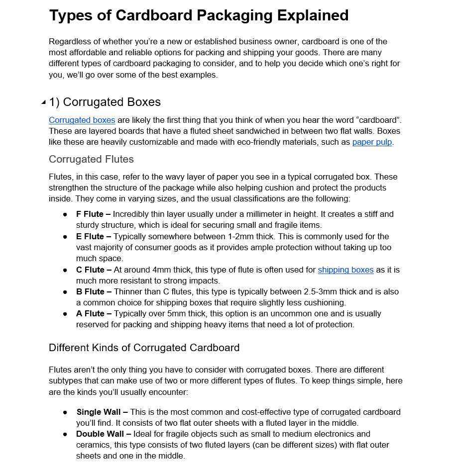 Search Intent: Informational – “What are the types of cardboard packaging?”, “Different types of cardboard boxes”, etc.