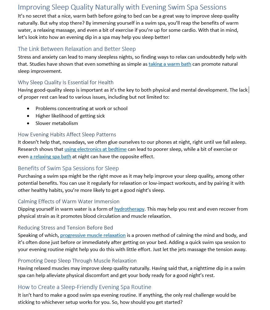 I was hired by a marketing agency on a freelance basis, and my first task for them was writing this blog post for a client that sells swim spas. The intent of this post was to target certain keywords listed in the content brief provided to me. Their brief already had headers as well, so most of my work involved research and composing the body.
